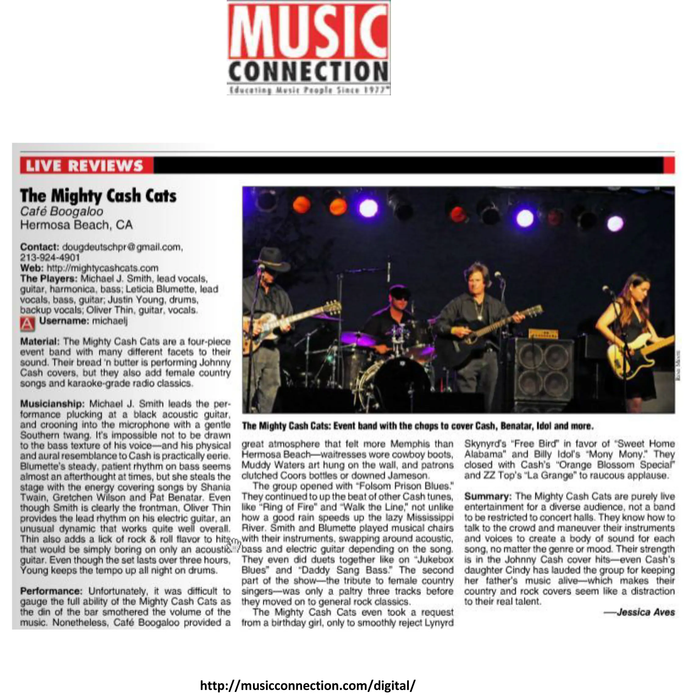 Mighty Cash Cats has received rave reviews, touring in the USA, Las Vegas, Europe, Ireland and Israel at Festivals, Fairs, Casinos, Theaters, Performing Art Centers, and Corporate Events. Recently the band was profiled on Germany’s highly rated TV show, “RTL Punkt12″ and appeared with Kris Kristofferson and Merle Haggard.
